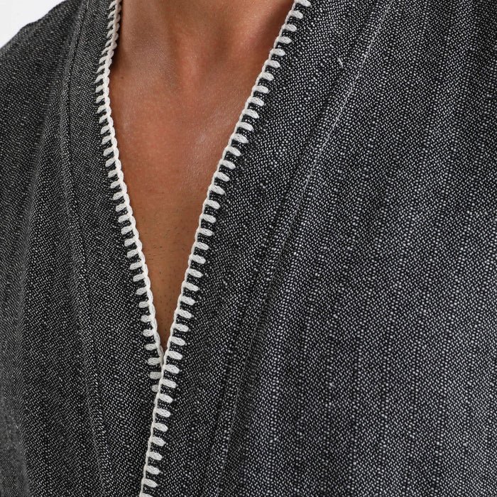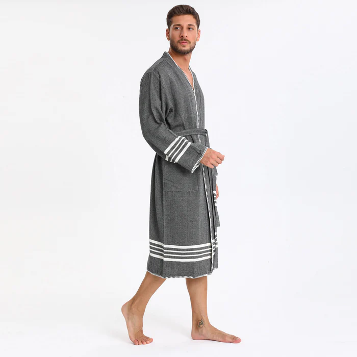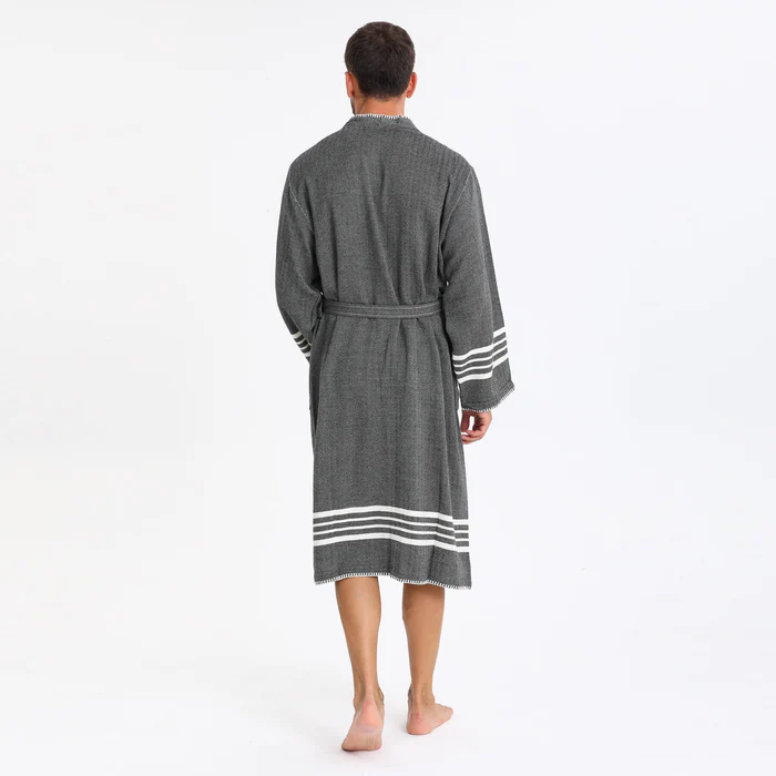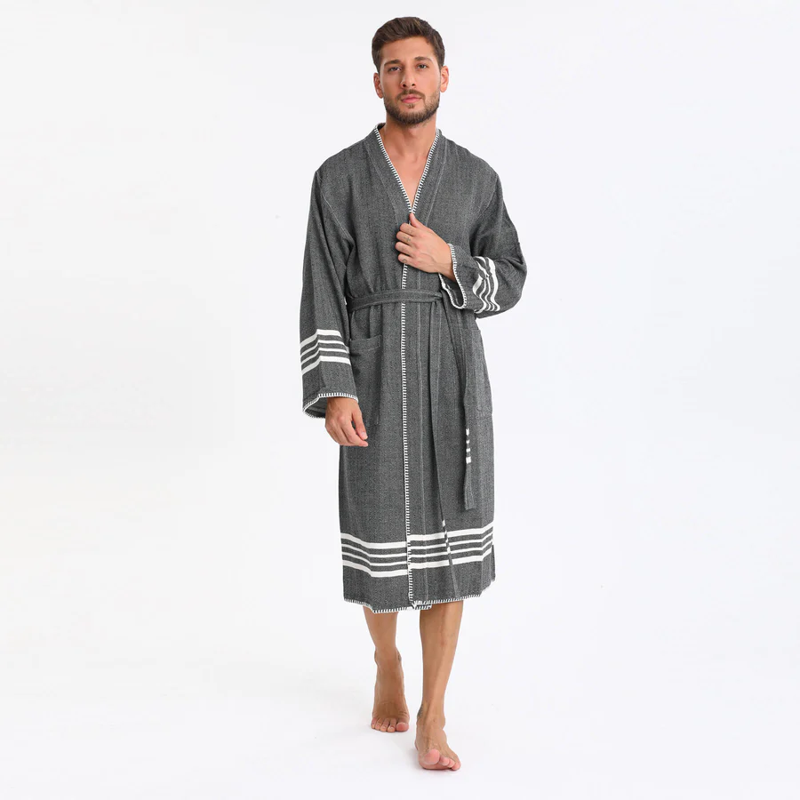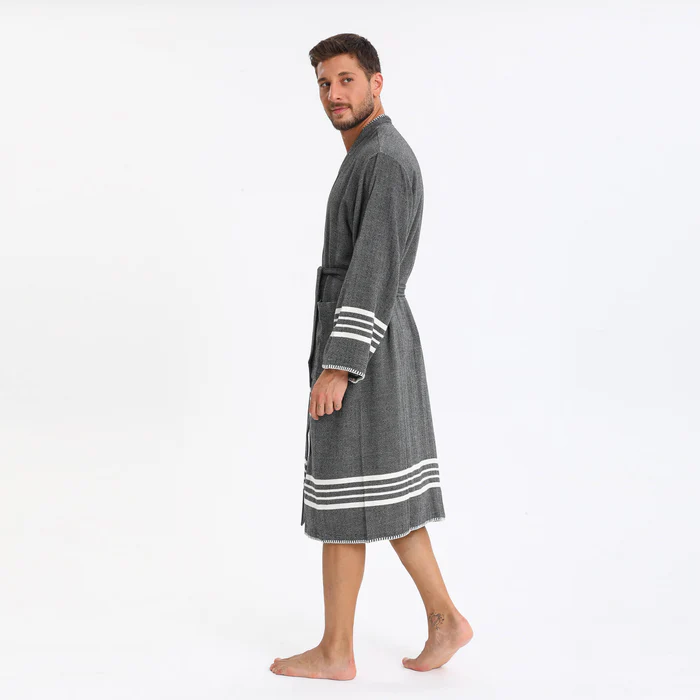 Elevate your relaxation experience with this Luxury Turkish Peshtemal Bathrobe in rich charcoal black. The deep, sophisticated color beautifully accented by crisp white horizontal stripes at the hem and cuffs, plus elegant white decorative stitching along the edges, creates a refined aesthetic that exudes modern elegance. Designed as a unisex style with exceptional attention to detail, this lightweight bathrobe combines authentic Turkish peshtemal tradition with luxury finishing touches, perfect for those who appreciate breathable comfort with distinctive style.