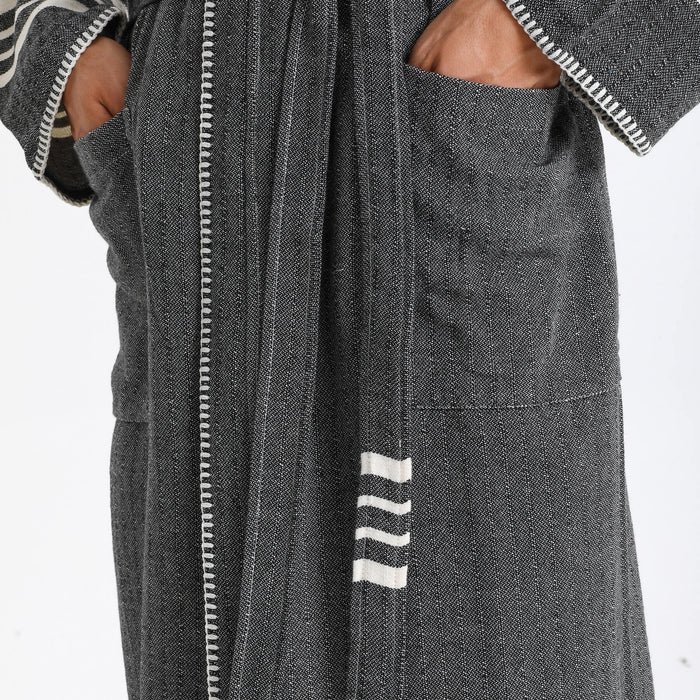 Expertly hand-loomed by skilled Turkish artisans using centuries-old weaving techniques, this bathrobe represents the finest tradition of Turkish textile craftsmanship. The smooth threads create exceptional softness and remarkable durability, while the rich charcoal black tone exudes contemporary sophistication. The classic white striped accents and decorative hand-knotted fringe details add artisanal character that elevates this bathrobe to luxury status.