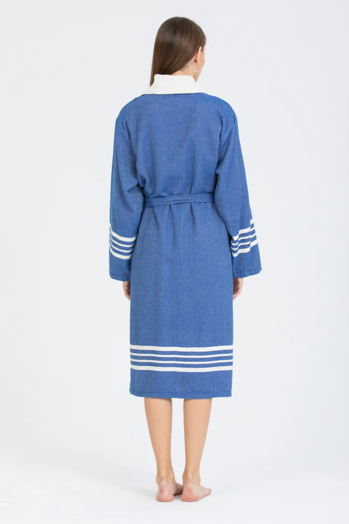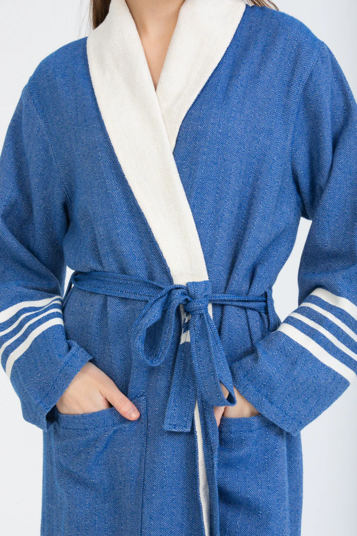Meticulously handcrafted by master Turkish artisans, this bathrobe embodies centuries of textile excellence. The striking royal blue evokes the elegance of traditional Turkish design, while the classic white horizontal stripes at the hem, cuffs, and coordinating belt create sophisticated visual interest that stands the test of time.