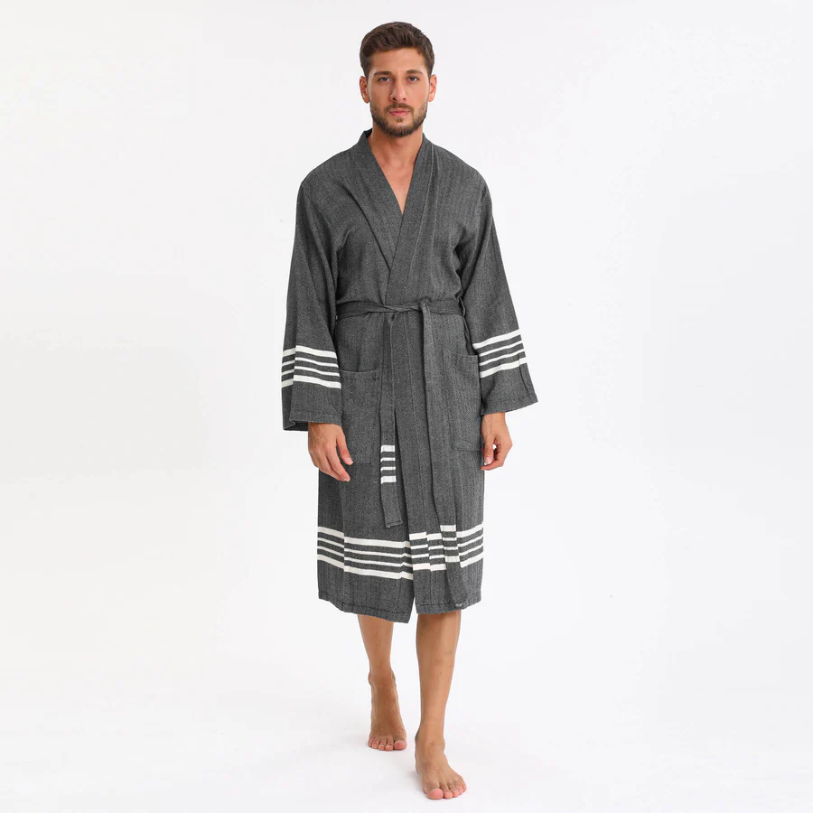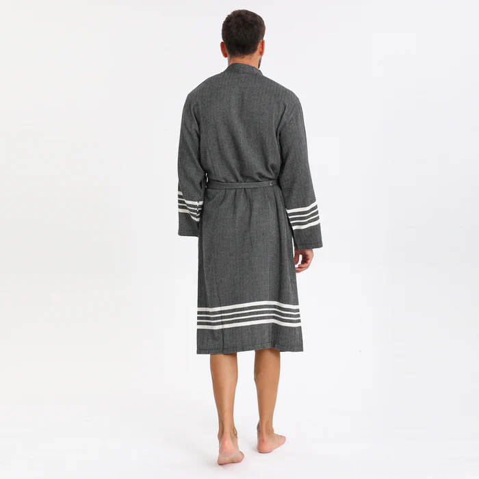 Discover refined elegance with this Turkish Peshtemal Bathrobe in striking charcoal black. The rich, sophisticated color beautifully contrasted by crisp white horizontal stripes at the hem and cuffs creates a bold, modern aesthetic with coastal charm. Designed as a unisex style with timeless appeal, this lightweight bathrobe combines authentic Turkish peshtemal tradition with contemporary sophistication, perfect for those who appreciate breathable comfort with striking visual impact.