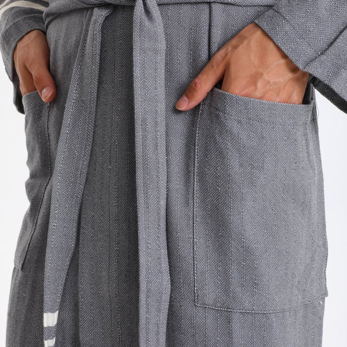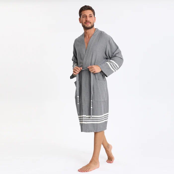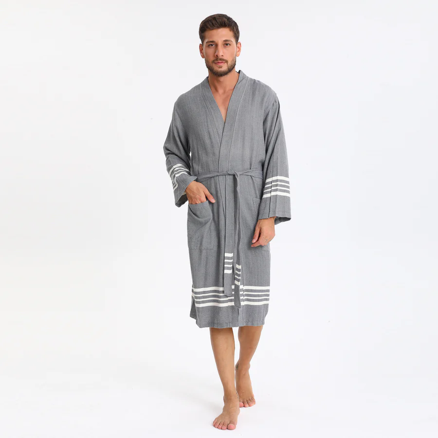 Experience refined comfort with this Turkish Peshtemal Bathrobe in sophisticated dark grey. The elegant, versatile tone beautifully enhanced by crisp white horizontal stripes at the hem and cuffs creates a timeless, coastal-inspired aesthetic that elevates any space. Designed as a unisex style with universal appeal, this lightweight bathrobe combines authentic Turkish peshtemal tradition with contemporary elegance, perfect for those who value breathable luxury in classic neutrals.
