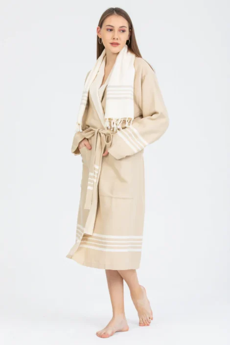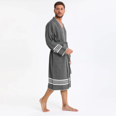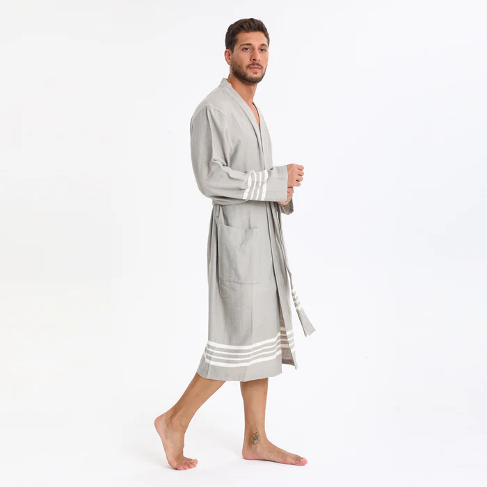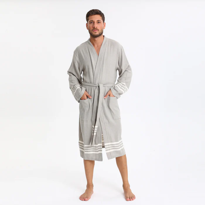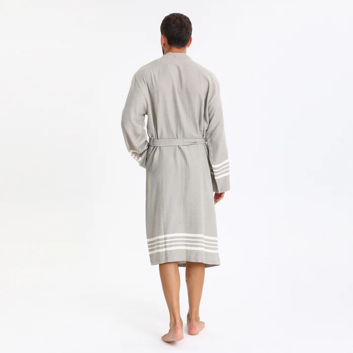 Elevate your relaxation experience with this Turkish Peshtemal Bathrobe in elegant light grey. The refined, neutral tone beautifully enhanced by crisp white horizontal stripes at the hem and cuffs creates a sophisticated, coastal-inspired aesthetic that complements any style. Designed as a unisex piece with universal appeal, this lightweight bathrobe combines authentic Turkish peshtemal tradition with contemporary elegance, perfect for those who appreciate breathable, quick-drying comfort.