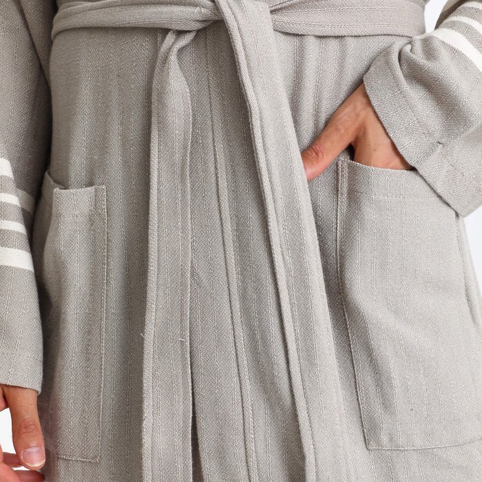 Expertly woven by skilled Turkish artisans using time-honored techniques, this bathrobe showcases the finest tradition of Turkish peshtemal craftsmanship. The smooth and strong threads create exceptional softness and durability, while the subtle grey tone exudes understated sophistication. The classic white striped details add refined contrast that enhances the timeless, nautical-inspired design.