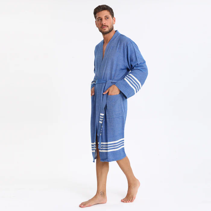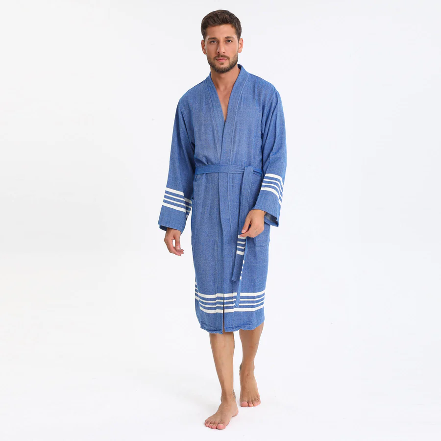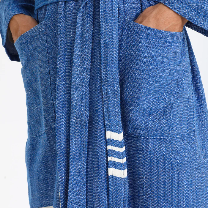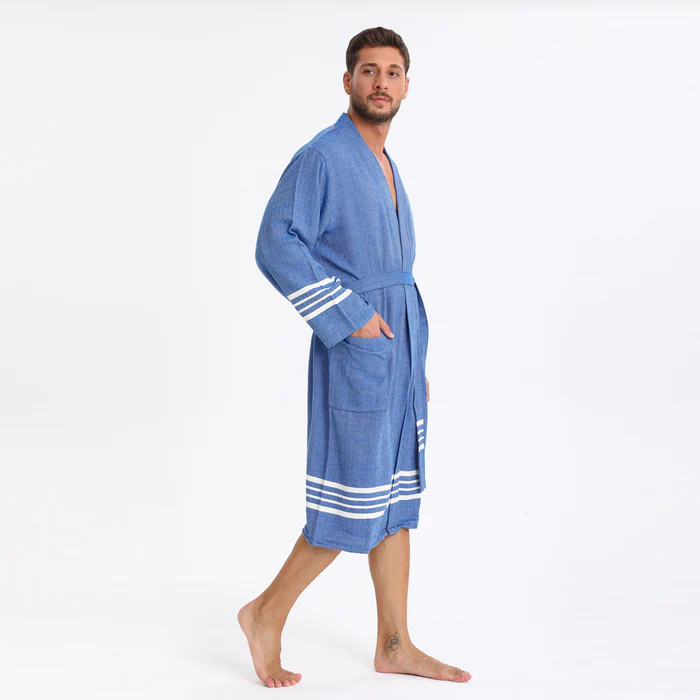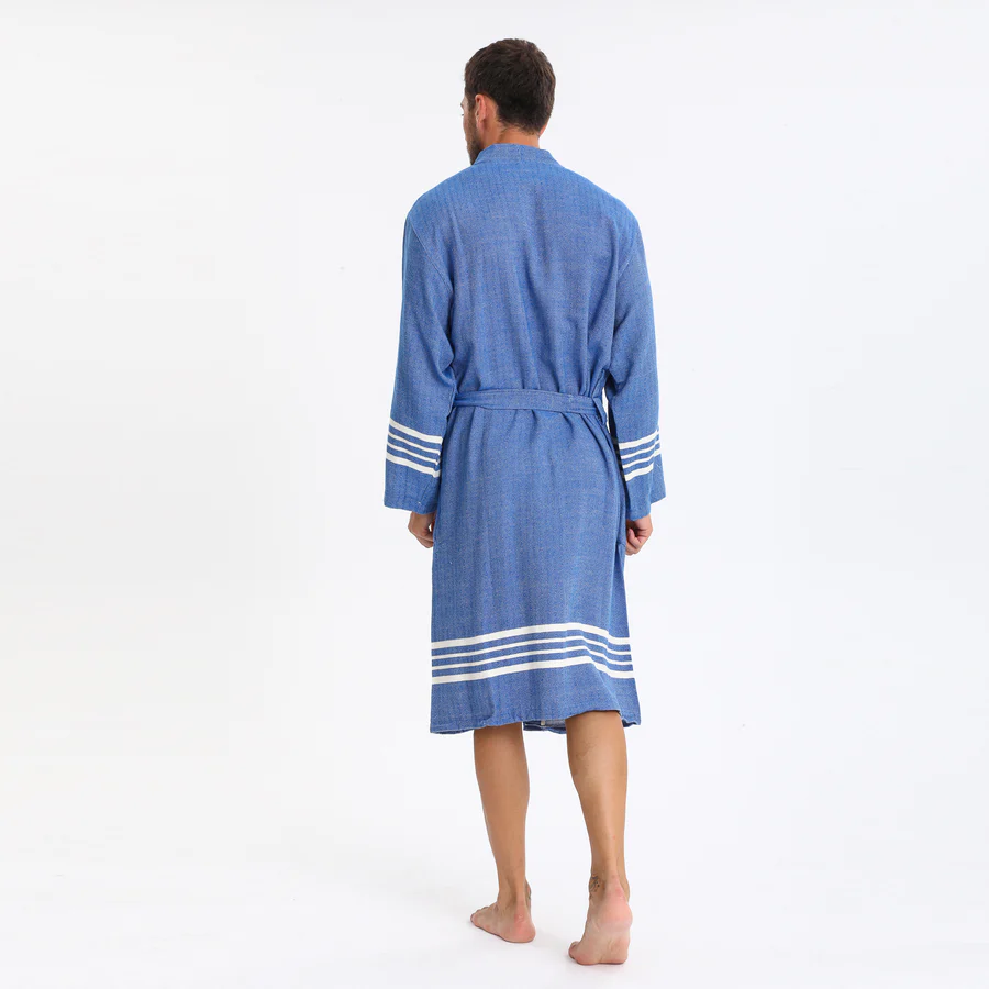 Immerse yourself in coastal luxury with this Turkish Peshtemal Bathrobe in stunning royal blue. The rich, vibrant color beautifully contrasted by crisp white horizontal stripes at the hem and cuffs creates a fresh, Mediterranean-inspired aesthetic that brings the spirit of seaside living to your home. Designed as a unisex style with timeless appeal, this lightweight bathrobe combines authentic Turkish peshtemal tradition with bold, captivating color, perfect for those who appreciate breathable comfort with striking style.